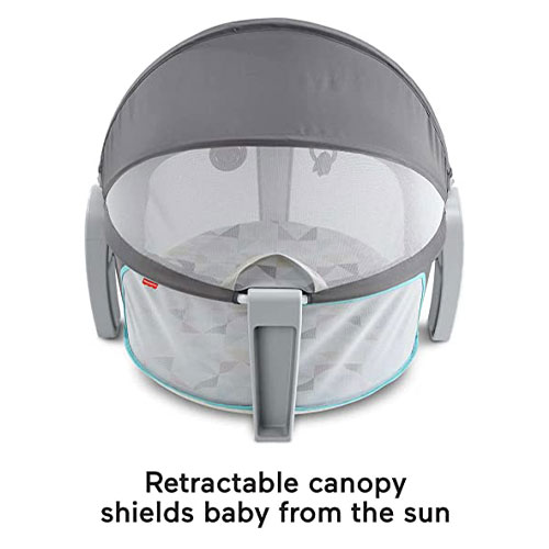 Your baby will feel right at home in the Fisher-Price On-the-Go Baby Dome. It features a comfy pad for your baby to nap or play on and a canopy that protects against pesky bugs and the sun’s bright rays. Two colorful toys dangle overhead, which can be removed and placed within your baby’s reach for playtime. And when you’re heading out with your favorite copilot, simply fold the dome and you’re ready for the next adventure! Use only with a child who is unable to push up on hands and knees, pull up, or sit unassisted.